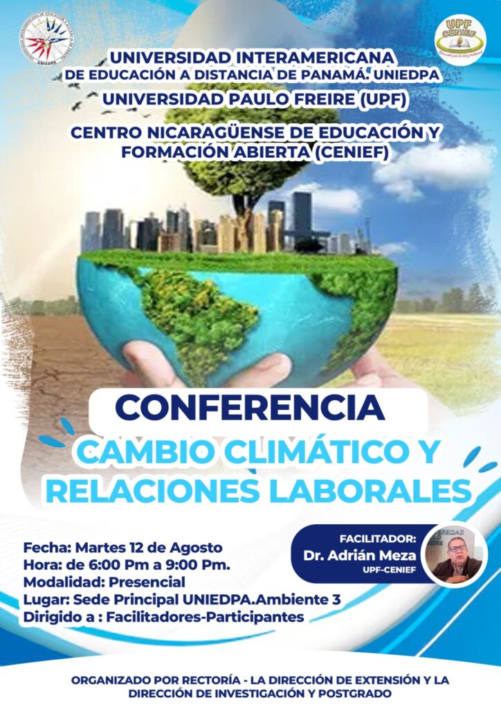 El pasado 12 de agosto el Prof. Adrian Meza nos acompañó con una magistral conferencia titulada "Cambio Climático y Relaciones Laborales", como parte del convenio CENIEF-UPF UNIEDPA. Esta actividad fue realizada de manera presencial en UNIEDPA Panamá.