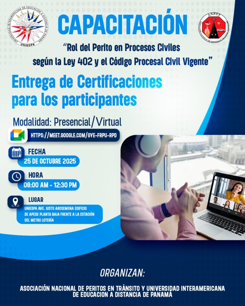 En días pasados se desarrolló en las instalaciones de la universidad, la capacitación "Rol del Perito en Procesos Civiles según la Ley 402 y el Código Procesal Civil vigente" de manera presencial y virtual. Este evento fue organizado por la Asociación Nacional de Peritos en Tránsito y la UNIEDPA.