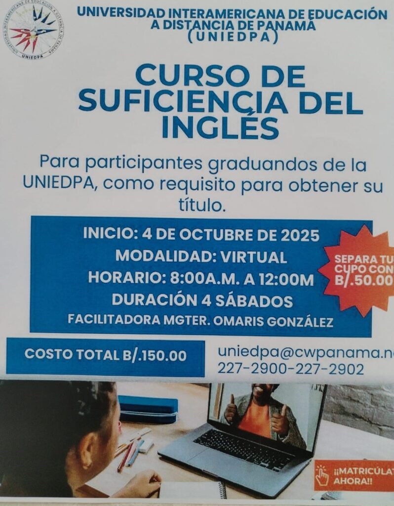 UNIEDPA desarrolló el segundo Curso de Suficiencia del Inglés como parte de los requisitos que los estudiantes deben realizar para obtener su titulo de grado. Este curso se realizó durante 4 sábados y la encargada del mismo fue la Mgter. Omaris González, quien impartió sus conocimientos en el idioma Inglés a los estudiantes.
