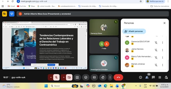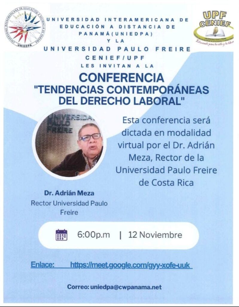 Una conferencia internacional denominada "Tendencias Contemporaneas del Derecho Laboral" fue realizada recientemente como parte del Convenio Marco firmado entre UNIEDPA y UPF-Senief, impartido por el Dr. Adrián Meza y en el que participaron estudiantes, cuerpo docente e invitados internacionales.